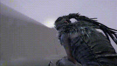 ―Senua listening to the whispers of furies while climbing a mountain.
